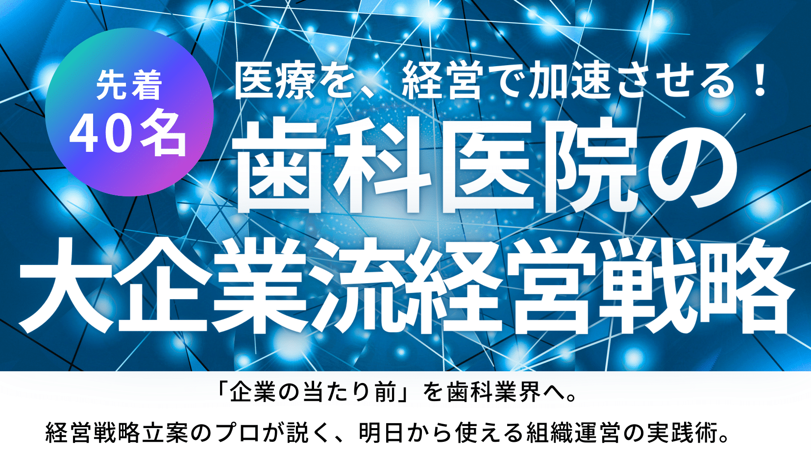 タイムスケジュール | 10:00~10:10:開会・挨拶 10:10~12:30:『歯科医院の大企業流経営戦力』講演会・質疑応答 12:30~12:55:休憩 13:00~14:30:懇親会・ブース出展紹介 |
